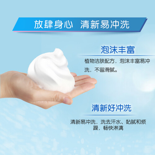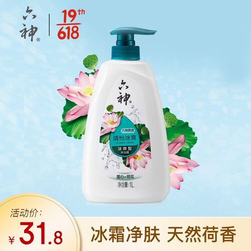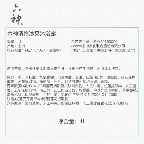 1L容量瓶装款,可男女通用。运用双重植萃配方打造,具备温和清洁效果。添加六神原液成分,能清爽肌肤,洗后更舒服。