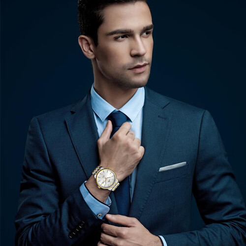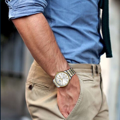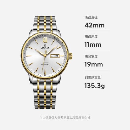 经典大开面,幼砂纹工艺,让手表品质随处可见,而经典圆形表壳设计搭配精钢间金表带,既显得手表时尚又显尊贵。