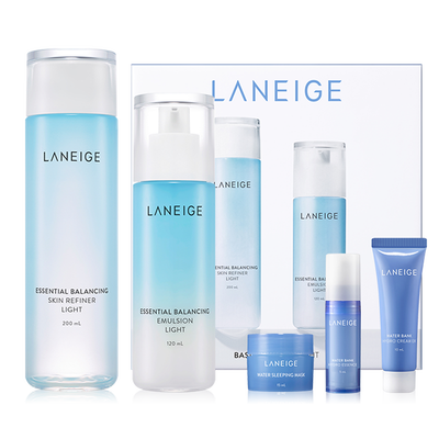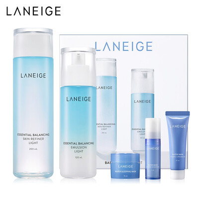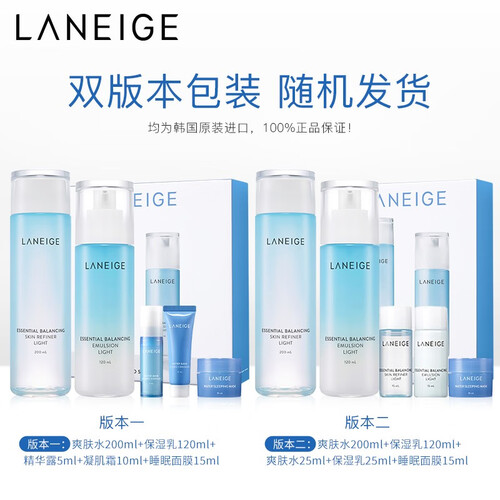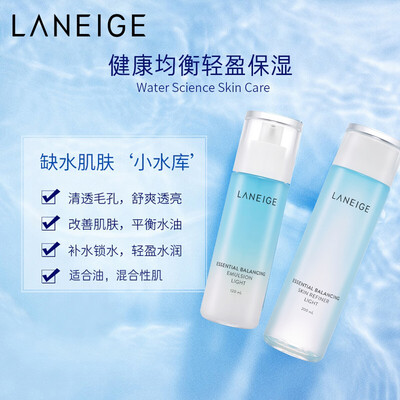 清爽型水乳套装,精华水含矿物质离子水和烟酰胺,补水同时温和清洁角质,保湿乳添加能减少水分流失的精氨酸,两步缔造轻盈水润。