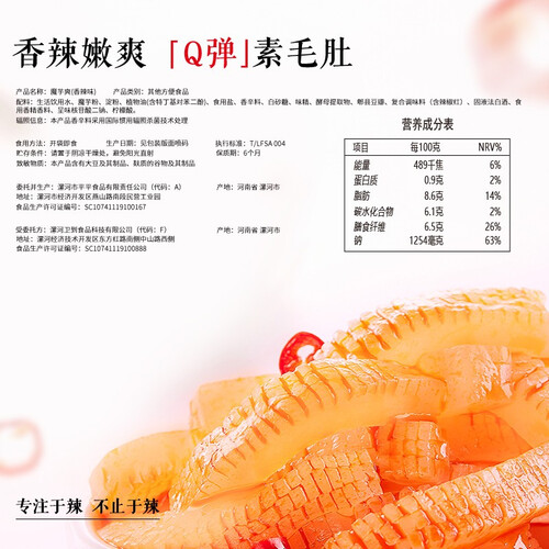 这款素毛肚甄选产自云南的优质花魔芋为原料,吃起来QQ弹弹、香辣爽口,像吃火锅里的涮毛肚一样过瘾。