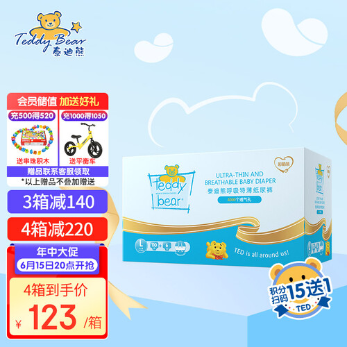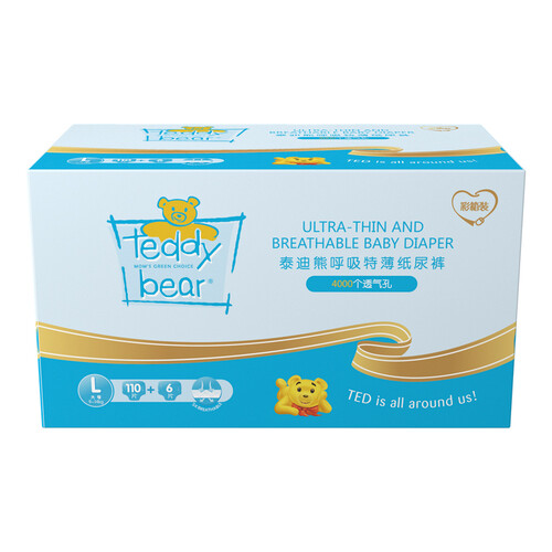泰迪熊纸尿裤采用干爽的网面,绵柔底膜蕴含多个呼吸小孔,增强吸收力、透气性好,让宝宝娇嫩的小屁股长效干爽,睡得更安稳!