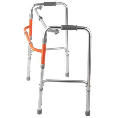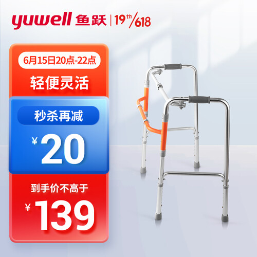 鱼跃助行器主体采用高品质铝合金材料制作,轻便灵活,无需用力,只需轻按收合弹销即可收合,存放不占空间,携带方便,轻松出门。