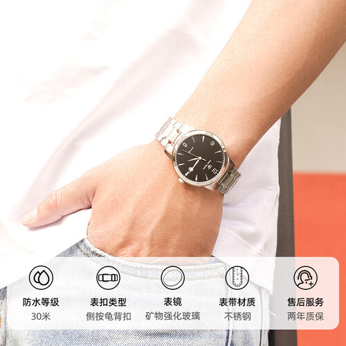 该款表带有日历显示设计,把握生活中的分分秒秒,不错过重要时刻;不锈钢大表盘设计,长久使用不易损坏,大气时尚。