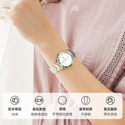 不锈钢表壳,搭配矿物质玻璃镜面的设计,令手表久戴不易刮花受损。进口石英机芯保障手表走时准确性,且具有更长久的运行寿命。
