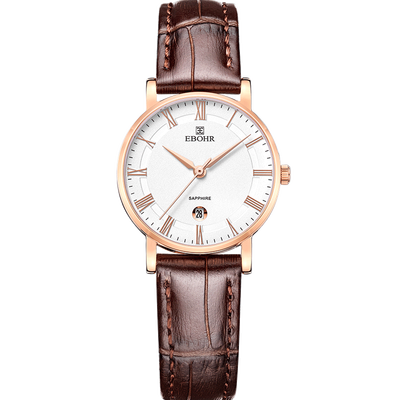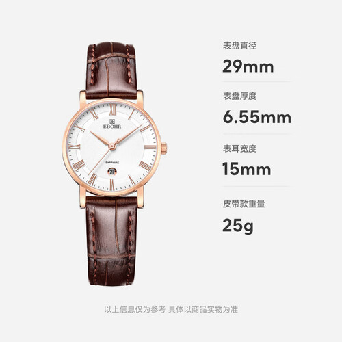 时尚的玫瑰金色与醇厚的粽色搭配,彰显复古暖调。纤细的罗马时符搭配刀形针设计,张扬个性,清新脱俗,彰显秀雅魅力。
