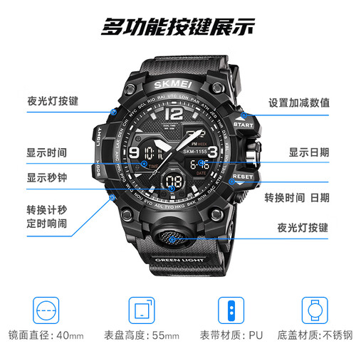 这款手表采用ABS防震材质打造,具备出色的抗摔性能。高品质的树脂镜面,清晰耐刮,使用寿命更长久。