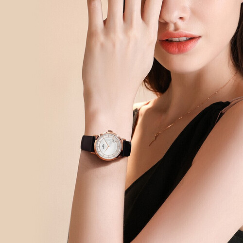 漆皮的表带经过多重工艺加工,兼具颜值和舒适性,凸显职场女性的成熟和稳重。瑞士原装石英机芯,走时精准。