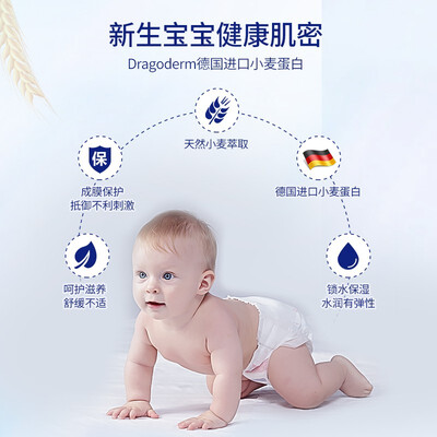 德国进口小麦蛋白呵护肌肤,水润滋养,帮助舒缓不适。成膜保护抵御外界的不利刺激,呵护新生儿皮脂膜,让宝贝肌肤细滑润泽。
