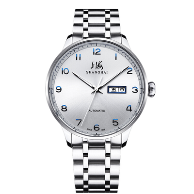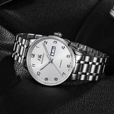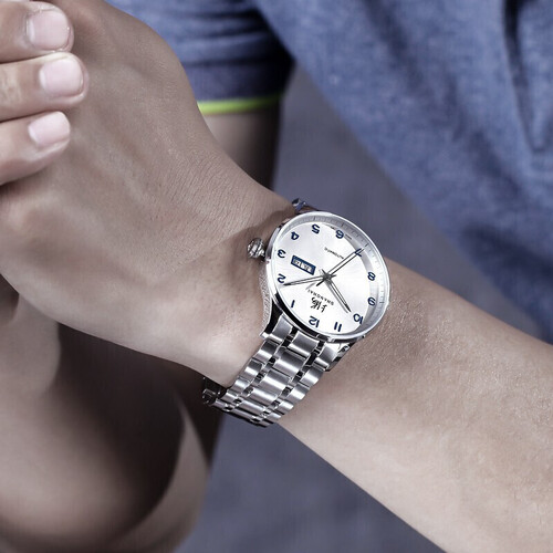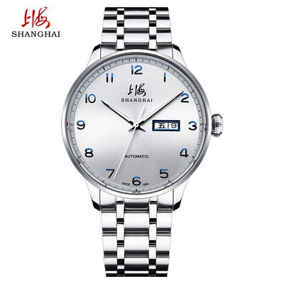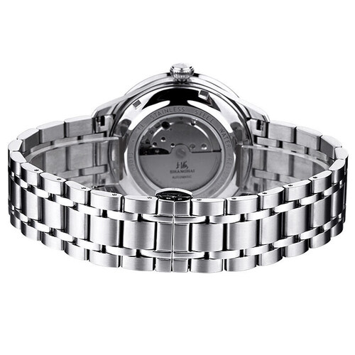 上海手表这款商务手表,采用了透明的表盘低部能够看到机械内部走动的模样,感受机械的美感,蝴蝶双按扣能更加的牢靠的戴在手上。