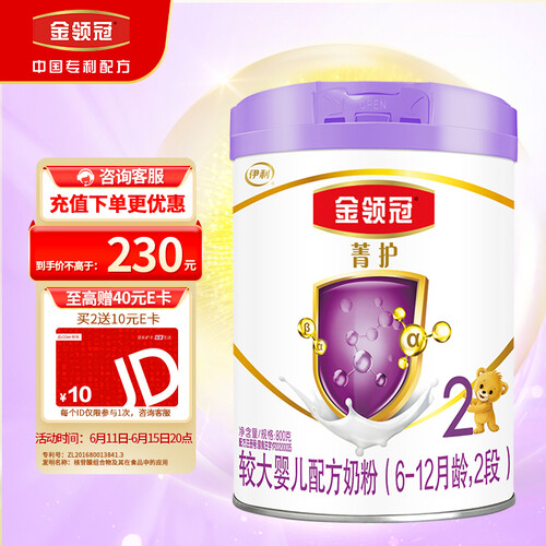 伊利金领冠菁护一直致力于适合中国宝宝的奶粉,这款奶粉富含DHA、牛磺酸、胆碱,能够帮助宝宝脑部发育,让宝宝更聪明。
