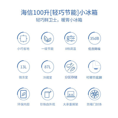 采用一体式U型箱体设计,能有效防止冷气外泄,内置有13升微冻室和87升冷藏室,可任意分类储存不串味。