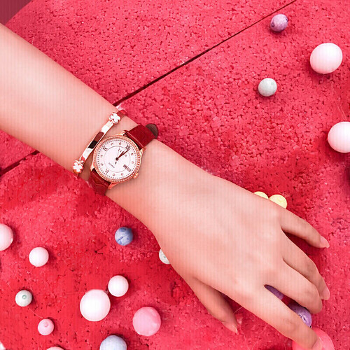表圈环镶锆石,呈现着闪耀明媚的光芒,尽显高雅气质。表带采用红色牛皮材质,不仅柔软亲肤,还可衬托皮肤的白皙。