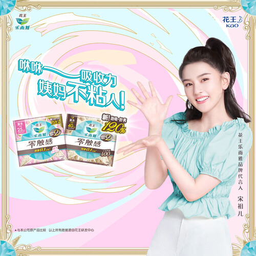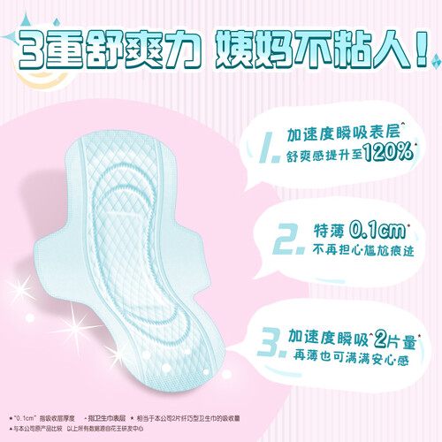 加速瞬吸表面,可以更快速吸收,保持干爽舒适。采用特别设计,没有尴尬痕迹,并且也没有明显负重感,同时是两片纤巧型卫生巾的吸收量。