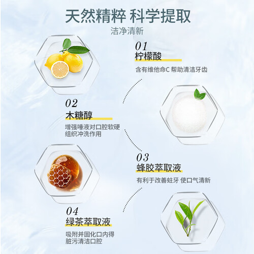 含有天然植物萃取精华,柠檬酸含有VC,可以清除污垢,洁白牙齿。特有的蜂胶萃取液有效改善烟渍问题,持久清新口气。
