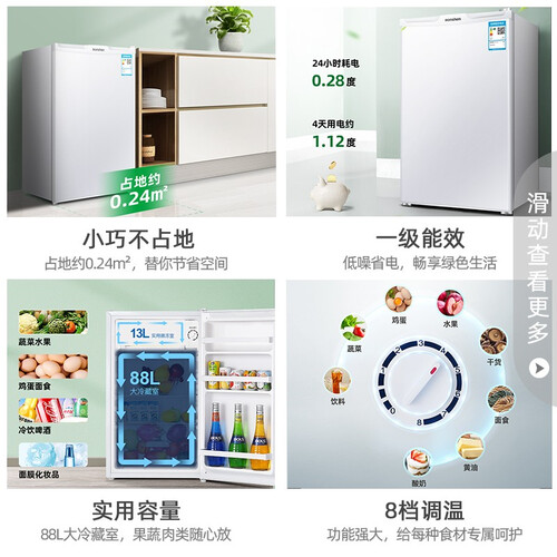 实用微冻室搭载着88L大冷藏,能满足一个人对水果、饮料的储存需求,其还静音运行,不打扰您和家人休息。