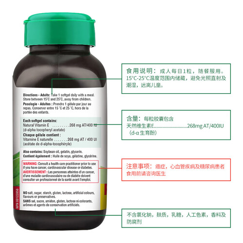 加拿大进口,400IU含量的维生素E,小分子更易吸收,提供心肌细胞营养支持,辅助清除氧自由基损伤,推荐成人服用。