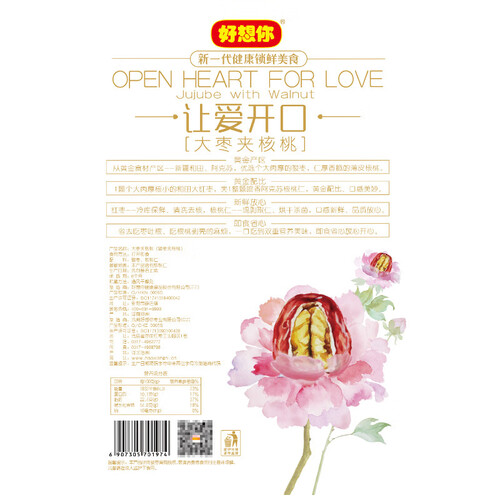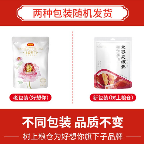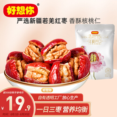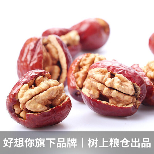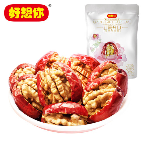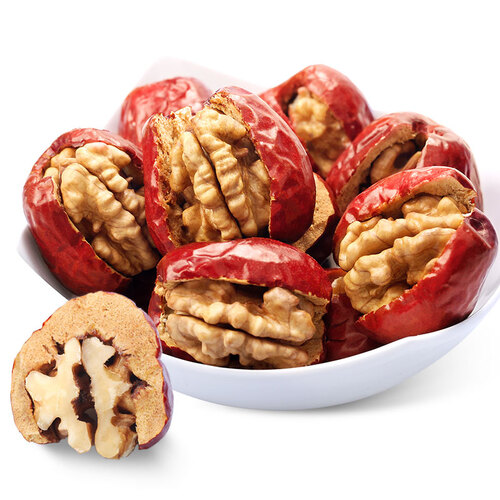 红润的红枣夹着淡黄色的核桃果仁,营养与美味兼得。而且红枣还没有枣核,让你吃起来更方便。