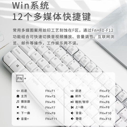快捷按键 | 采用排水孔设计,可方便液体从键盘中排出,不用担心咖啡与茶的意外,让生活更舒适随意。配合Fn控制键,您可以进行音乐播放等快捷操作,节省时间。