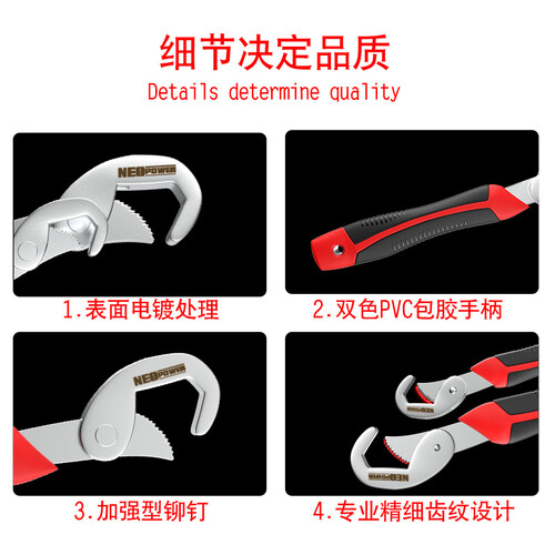 采用优质铬钒钢材质锻造,表面经过高频淬火和电镀处理,硬度高,耐磨耐用,夹持牢固。pvc包胶手柄,握持舒适。