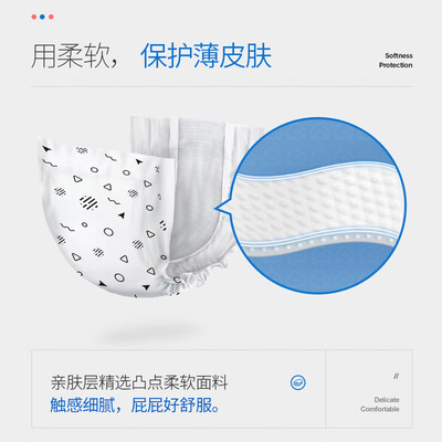 这款纸尿裤的亲肤层精选凹点柔软面料,触感细腻,让宝宝屁屁一直处于舒适状态,薄至3mm,透气效果极好,肌肤能自由呼吸。