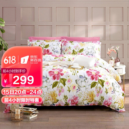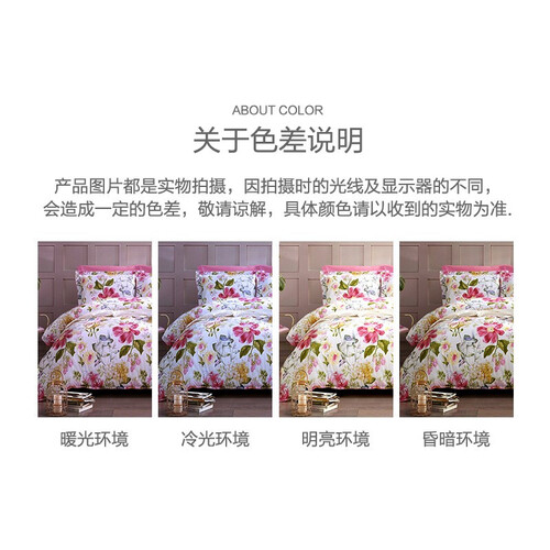 彩色印花工艺,带来春天般花草丛生的感觉,给卧室带来生机感。斜纹编织面料编织而成,摸上去光滑有质感,使用舒适。