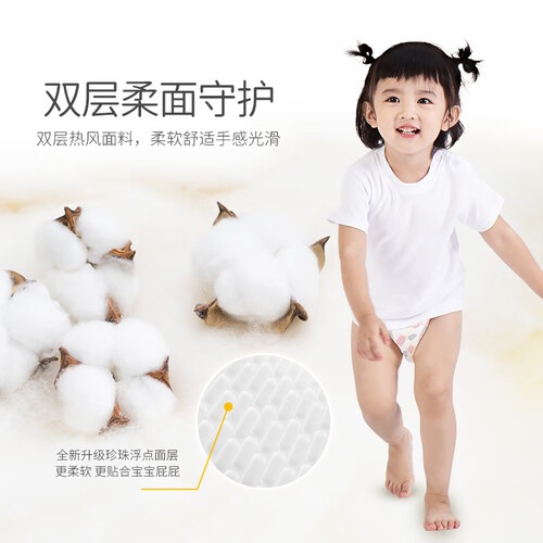 这款纸尿裤采用内外双面柔料,触感所及都能见证柔软,轻轻柔柔的呵护让宝宝更舒适。浮点凹槽面层能快速导流,吸收量更大。