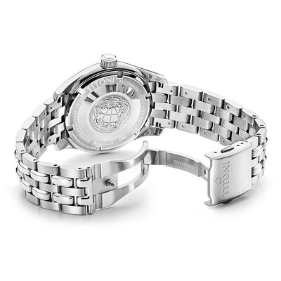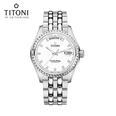 白色珐琅表盘时标镶嵌24颗锆石,精致时尚。带有梅花标志的表冠,彰显品牌魅力,方便调节时间。