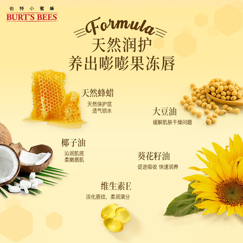 富含天然维生素E,长效保湿,滋养呵护双唇;搭乘蜂蜡精华,锁水保湿,舒缓干燥唇部,令双唇长效润泽,比脸部肌肤更娇嫩。