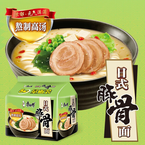 浓郁鲜香|深夜不想吃辛辣,那么这款浓郁鲜香、营养滋润的康师傅日式豚骨袋面就是你的宵夜首选,汤头浓而不腻,荟萃精华,在吃完面条之后,一口干了,倍感满足。
