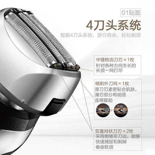 经典的曲线机身设计,搭配精致的纹理,易握防滑手感更舒适。四刀头系统,立体柔性贴合面部轮廓,温和舒适剃须。