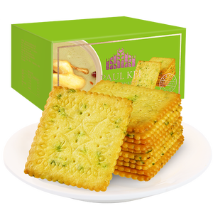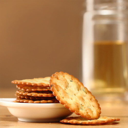 薄薄的一片饼干,一口咬下去,嘎嘣嘎嘣脆,让人心情愉悦。上面有绿色的小香葱片,给你带来地道的中式口味,让人回味无穷。