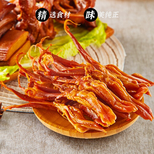 采用新鲜鸭舌结合多种香料卤煮而成,滋味鲜香有嚼劲,吃在嘴巴里很是过瘾。独立包装设计,方便携带,即开即食,美味与你相伴。