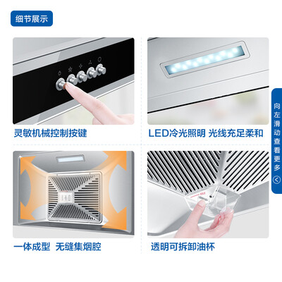 全封闭式优质电机,高效低噪让你静享烹饪好时光;内部双层油网设计,油烟极速过滤分离,油污导流防滴漏,清洗更方便。