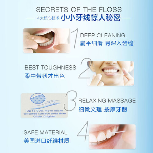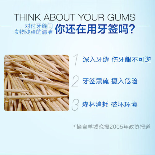 采用美国进口纤维材质,扁平细滑,深入齿缝清除食物残渣,呵护牙龈健康;还能按摩牙龈,适合餐后使用。