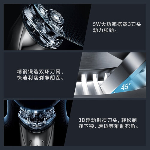 5W大功率搭载3刀头,动力强劲,双环刀网快速利落的剃净胡茬。全身水洗、干湿双剃,体面应对各种场合。满电待机时长60分钟,省时省心。