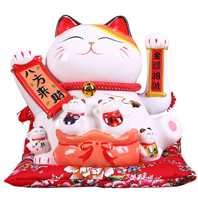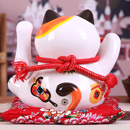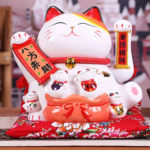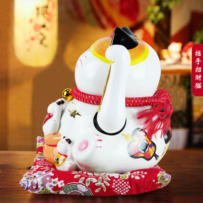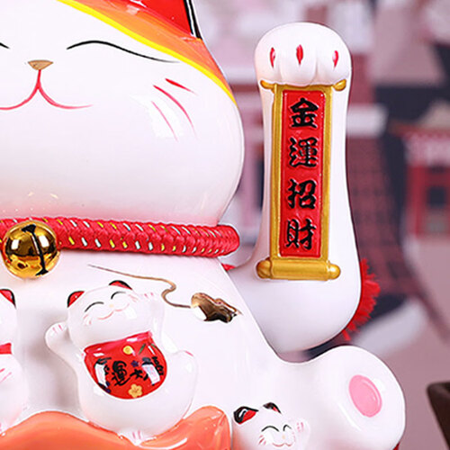 本款招财猫,接通电源后,手臂可以摆动,安静无声;胸前挂着铃铛,也有开运、招财、招福、缘起之意,蕴含美好希冀。