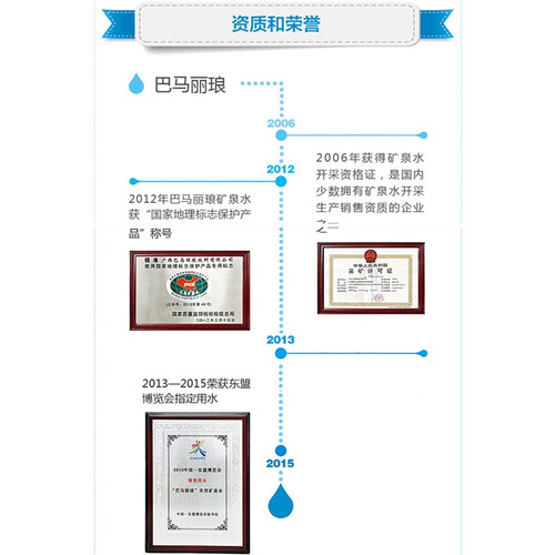 水源地在广西巴马长绿山,是国家地理标志保护产品。水质主要成分有锶、钙、镁、钠、钾、偏硅酸等天然矿物元素,入口清甜。