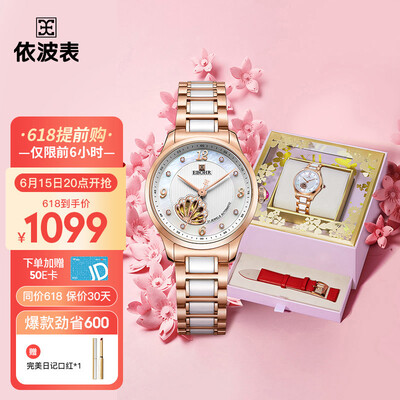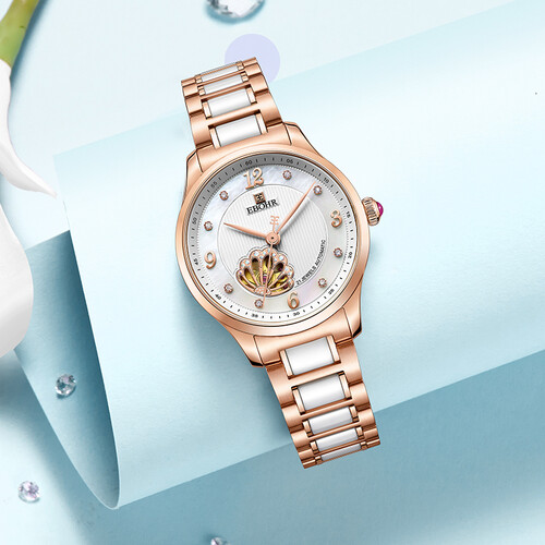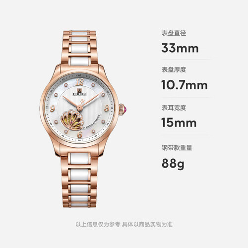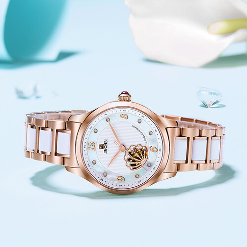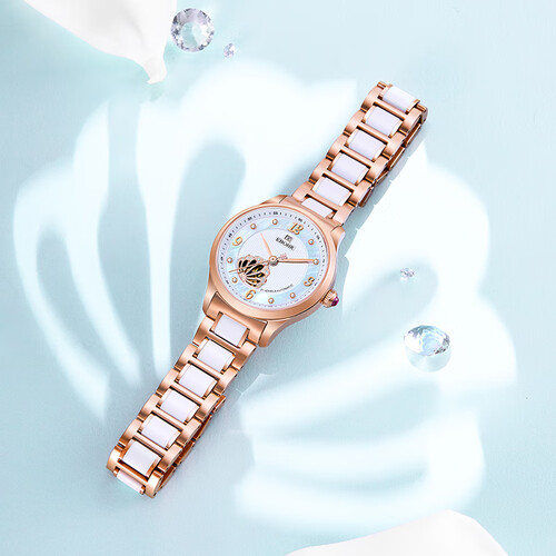 镂空皇冠,搭配绚烂母贝盘面,腕表看起来更具高贵典雅。陶瓷和实心钢带巧妙连接,表带触感温润,佩戴更舒心。
