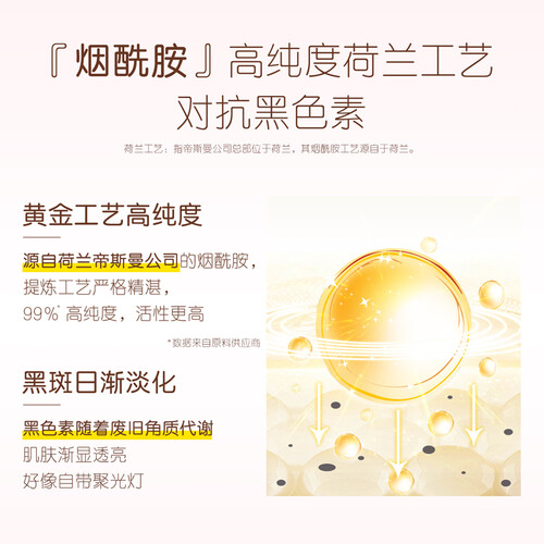 含有美白护肤的烟酰胺成分,能欧渗透肌底,针对性调理肌肤暗黄、色斑、痘印等问题。帮助代谢沉淀的黑色素,抑制黑色素的生成。