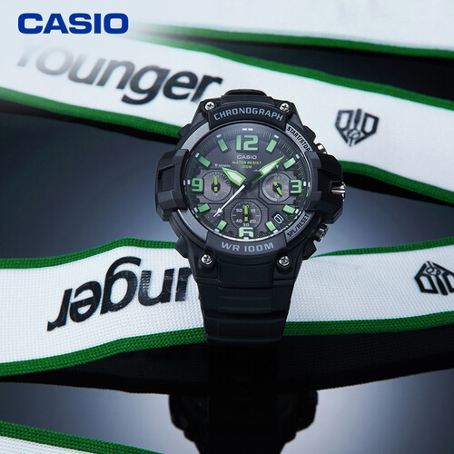 绿色的细节设计,在黑色基调的映衬下尤为亮眼,将造型的吸睛指数直线上升。100米防水深度,无惧雨淋和水溅,游泳戏水不用摘。