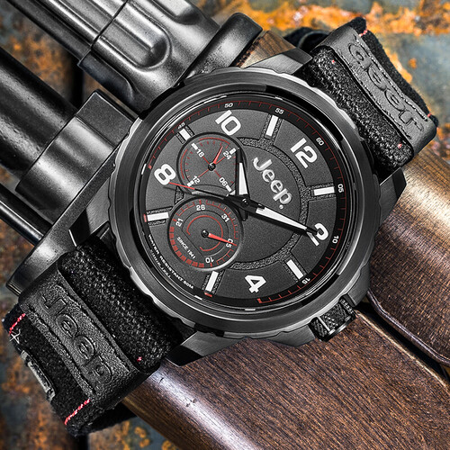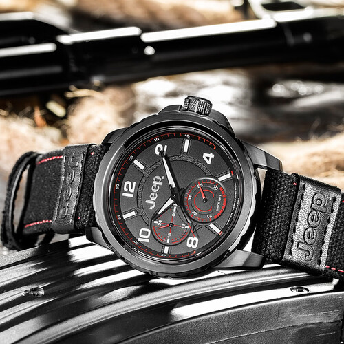 两个小表盘以Jeep汽车仪表盘作为设计元素,同时添加了机械感,让人眼前一亮。轮胎外形的表壳更让Jeep情怀落地。