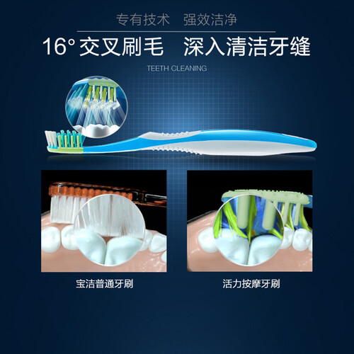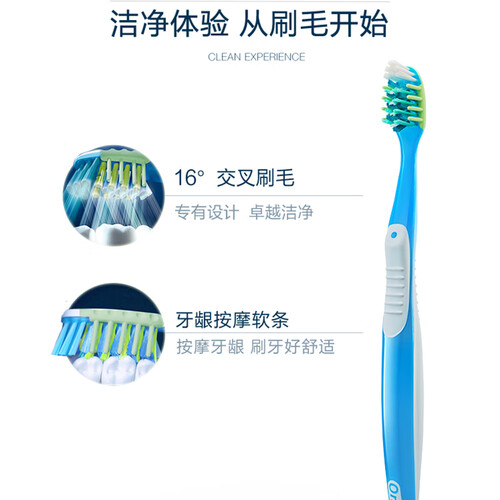 16°交叉刷毛设计,能深入清洁牙缝,清扫牙渍牙菌斑无残留。添加软条毛刷,温和按摩牙龈,给你更舒适清爽的刷牙体验。