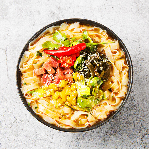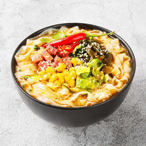 含有丰富的配料,脱水工艺加工,可以看见完整的颗粒。调料都是直接放置在面上,直接加水冲泡即可食用。