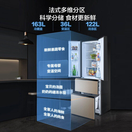 采用琥珀金面板,尽显高贵典雅气质,多层纹理设计,经久耐用;采用四门三温区设计,食材分门别类,保证食材新鲜。