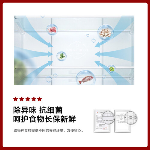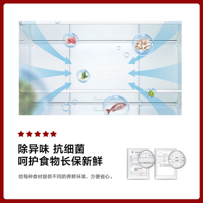 风冷无霜保鲜,全方位、多风道立体循环送风,冷气分布无死角,立体呵护新鲜;采用电脑控温,搭载离子净味系统,运行节能静音。