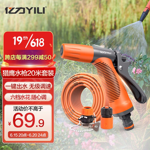家用高压可调节水枪,六档水花可无极调速,适应更多使用场景;20米长距离水管,不受接口限制;大弧度开关设计,有效防夹伤。