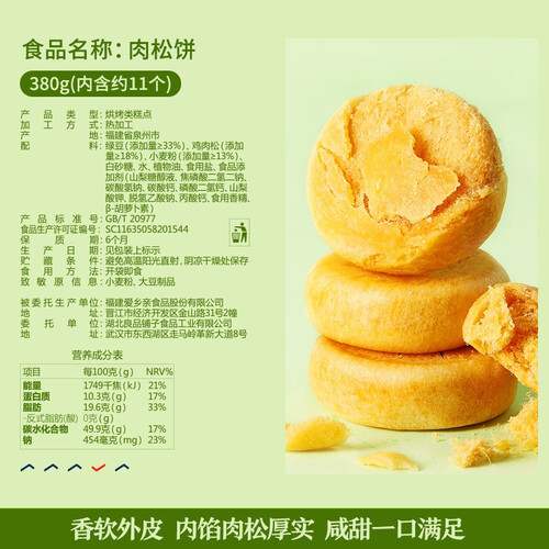 馅多皮软|这款肉松饼皮薄料足,色泽金黄诱人。轻轻咬上一口,看得见结实的肉松,诚意满满。软硬适中,口感香酥,肉松的咸味加上皮的鲜甜,奇妙的搭配使它吃起来清香不腻。