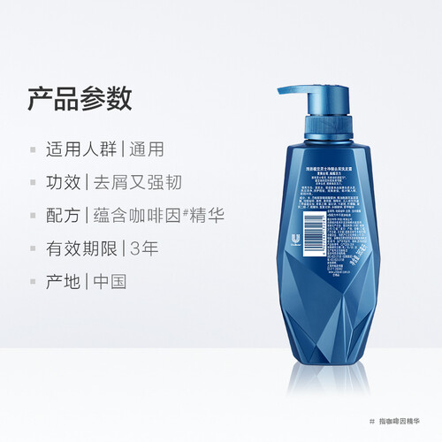 咖啡因精华代替硅油成分,真正有效去屑,令发丝更加强韧健康。钻石切割面瓶身,颜值控人群会喜爱,彰显品牌个性。