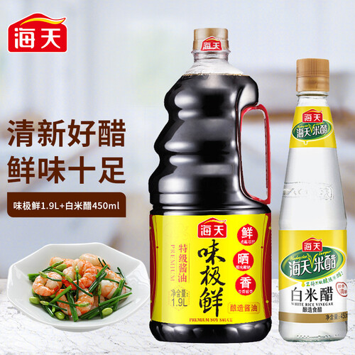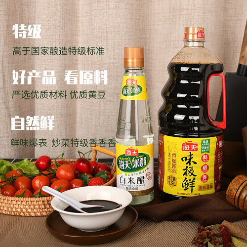 天然阳光晾晒的黄豆,酿造出高于特级标准的酱油,鲜味持久不散。低酸度的清新米醋,醋溜或凉拌时加入,口感鲜美回味无穷。