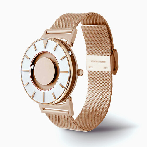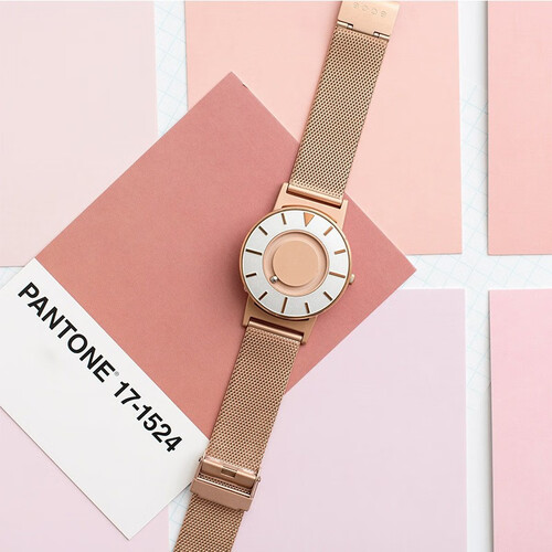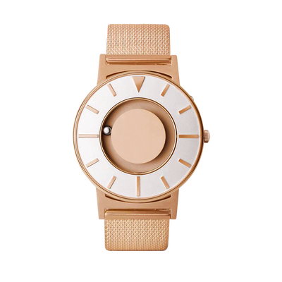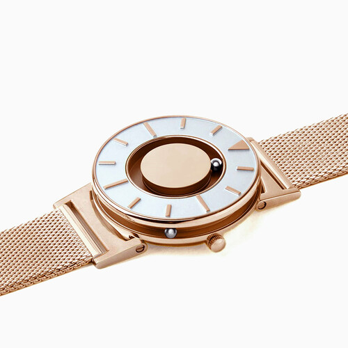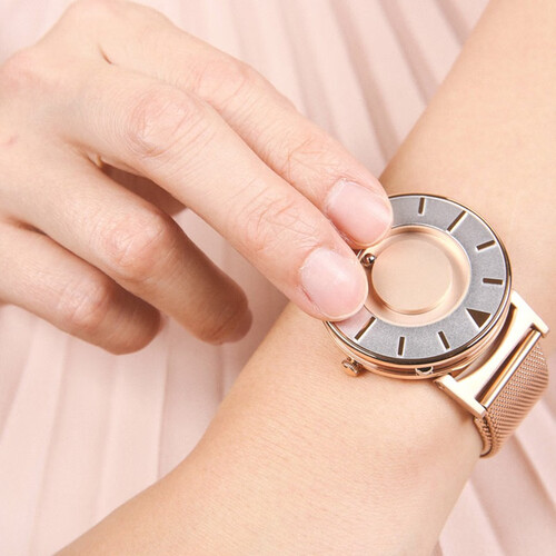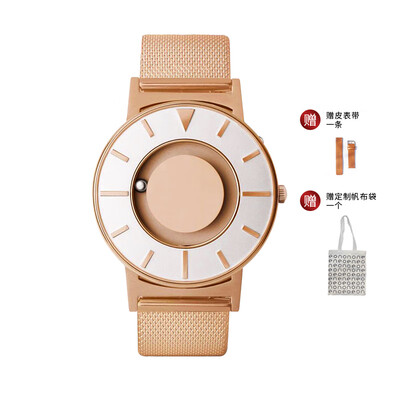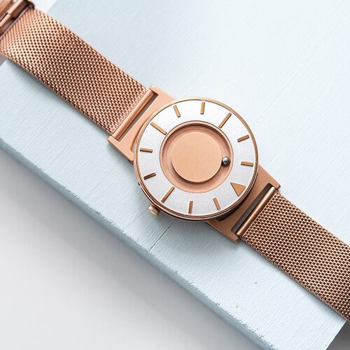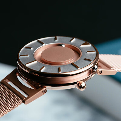 钢珠取代传统指针,表面钢珠代表分钟,侧面钢珠代表小时,创新触觉感知时间。采用米兰编织表带,柔韧细腻,佩戴舒适贴合手腕。